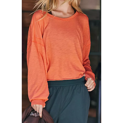 Features: Slight crop, longer sides; wide neckline; open-cut back; ribbed wrist detail
